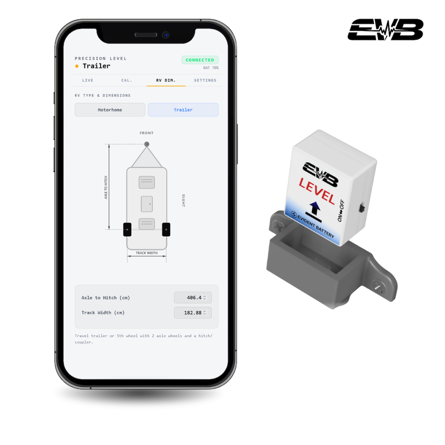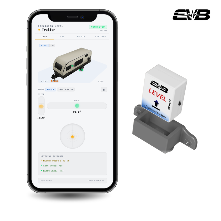 The EVB Level uses a high-accuracy 3-axis accelerometer to measure tilt and orientation in real time—displaying both front-to-back and side-to-side leveling on a single screen for fast, precise adjustments.
