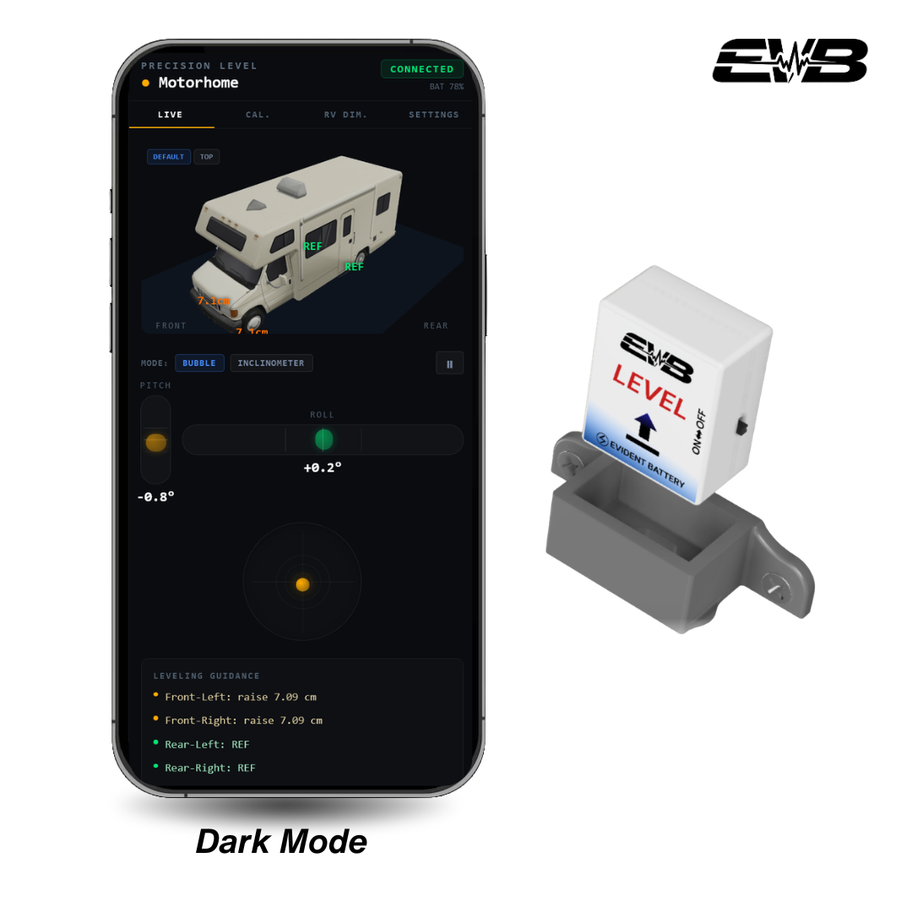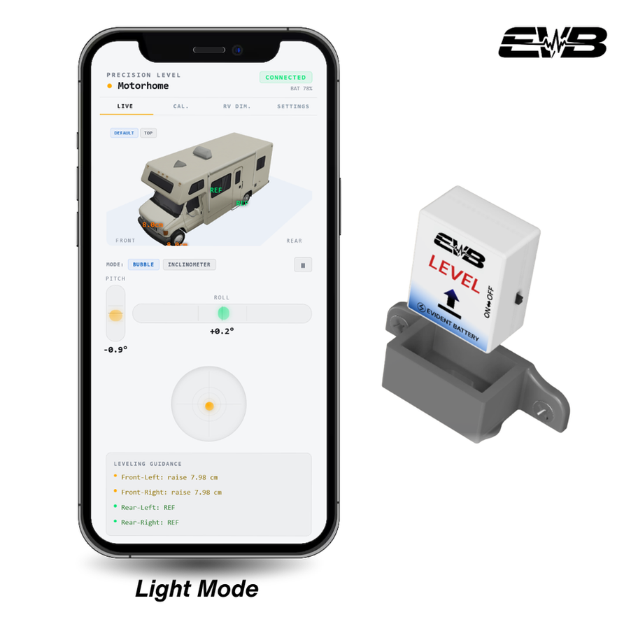 Get instant feedback on exactly how much adjustment is needed and where. EVB Level removes trial and error, enabling quick, accurate leveling by a single user—even in low-light conditions.