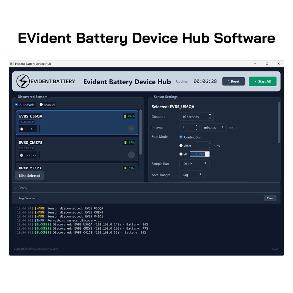 EVident Battery’s Device Hub software is a lightweight desktop tool that makes it easy to set up and manage large fleets of sensors from one place. It streamlines day-to-day workflows like device discovery and grouping, configuration and calibration, synchronized start/stop control, health/status checks, and bulk firmware updates—so you can deploy, operate, and troubleshoot quickly without manual one-by-one work. Device Hub also supports direct data download to your computer (for offline workflows) and integrates smoothly with optional cloud services when you want centralized storage, collaboration, and advanced analytics.